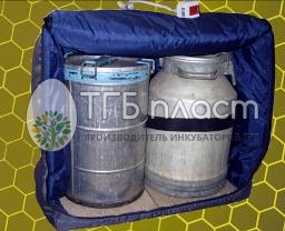 Именно в этом качестве она и прошла успешные испытания, которые производились не только с 40 литровыми алюминиевыми флягами, но и с пластиковыми ёмкостями, поставленными друг на друга. В этом случае датчик температуры (расположенный на пояске, застегивающемся при помощи «липучки») во избежание перегрева верхней ёмкости располагают именно на ней, независимо от материала её изготовления. При использовании относительно высоких емкостей, устанавливаемых в один ряд, поясок с датчиком располагают примерно в средней части металлической емкости, а на пластиковых - ближе к верху. При установке в одной термокамере металлических и пластиковых емкостей, поясок устанавливают на пластиковой. Если к уже прогретой емкости добавляется еще одна, не прогретая, то датчик остается на теплой.